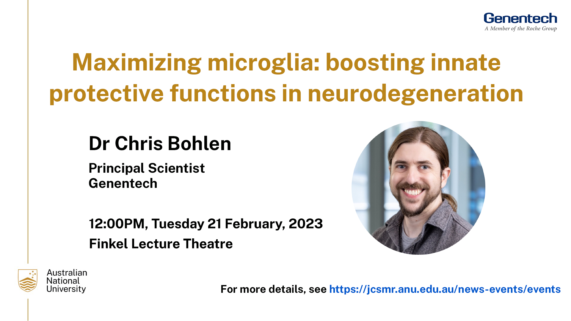 Chris Bohlen is a Principal Scientist at Genentech, where he has been striving to develop new drugs for modulating neuroinflammation in neurodegenerative diseases since 2017. Chris has a background in genetics and cellular biology, having studied mechanisms of pain-causing venoms in David Julius' lab (UCSF) for his PhD thesis, and having investigated microglia activation and phagocytosis mechanisms in Ben Barres' lab (Stanford) during his postdoctoral fellowship. Chris is currently focused on microglial contributions in Alzheimer's Disease, and is pursuing forward genetic efforts to identify new targets/pathways for future therapeutics.