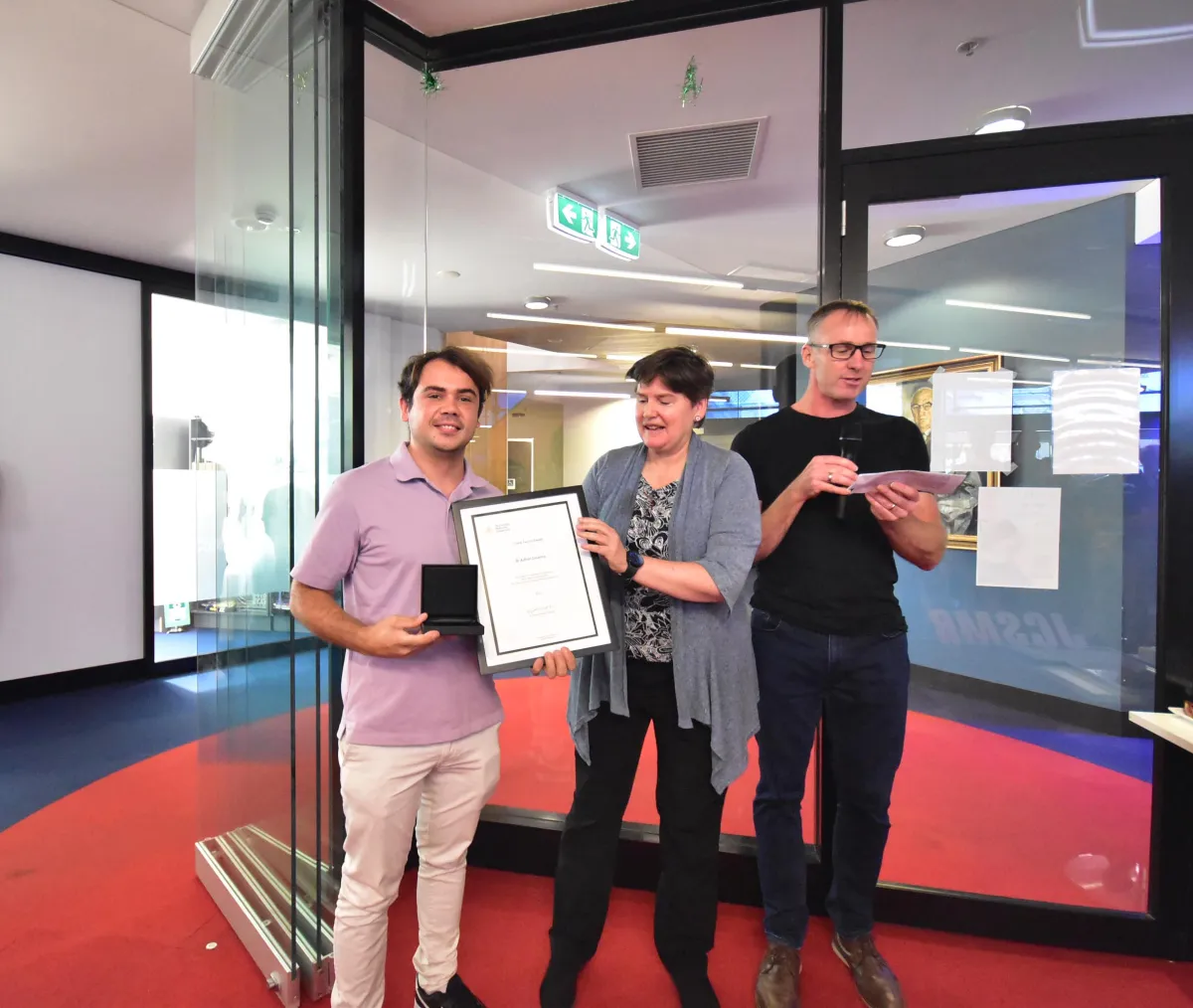 Dr Adrian Cioanca receiving the award from JCSMR Director Professor Elizabeth Gardiner (C). JCSMR Associate Director (HDR) Associate Professor Brendan McMorran (R) also in the picture.