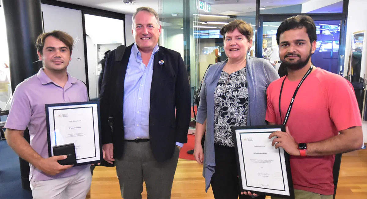 (L-R) Dr Adrian Cioanca, Professor Russell Gruen (the Dean, ANU College of Science and Medicine), Professor Elizabeth Gardiner (JCSMR Director), and Dr Abhimanu Pandey (winner of the Dewar-Milne Prize).