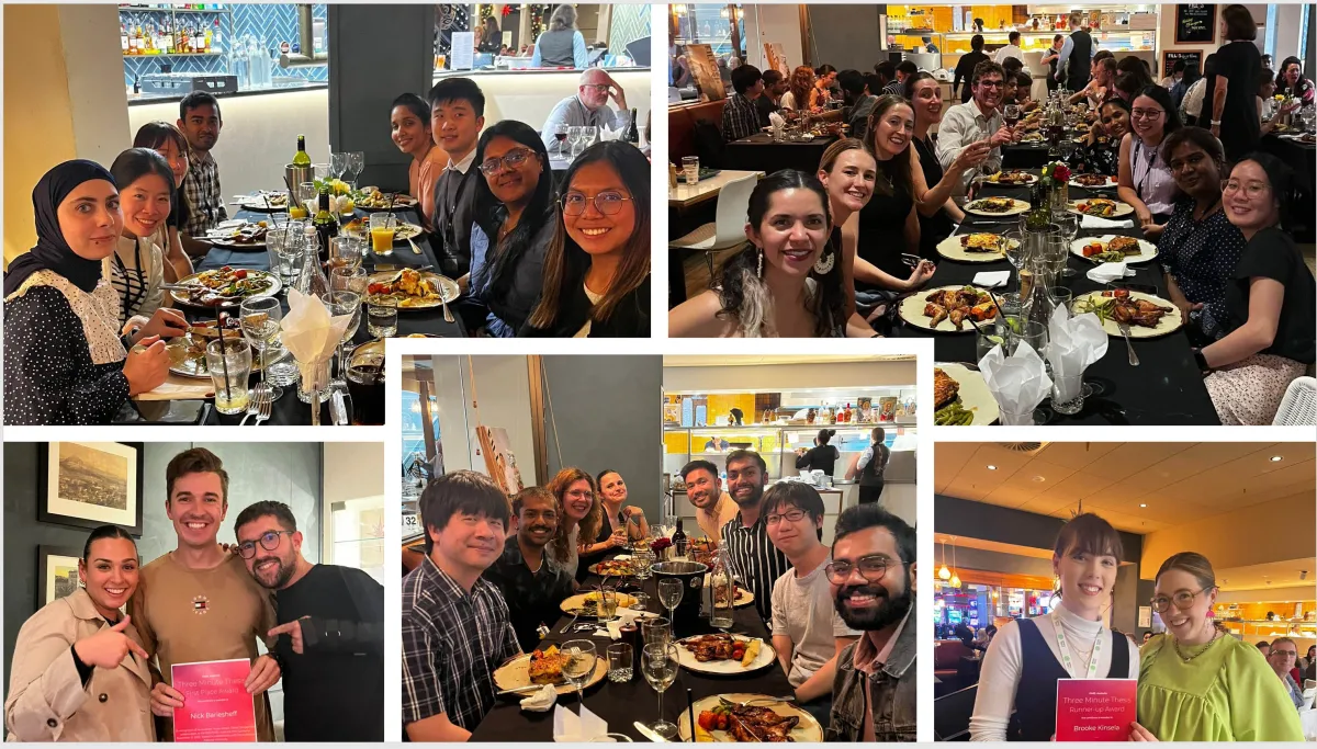 Lifelong friends. Students at the EMBLA PhD Course Closing Dinner. Bottom Left. Nick Bariesheff, takes 1st place for the 3MT competition. Bottom Right. 3MT competition runner-up, Brooke Kinsela.