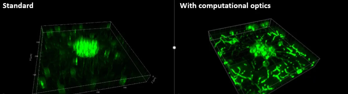 Volumetric imaging of actin distribution of spheroids, Left - Standard (confocal), Right - With Computational Optics.