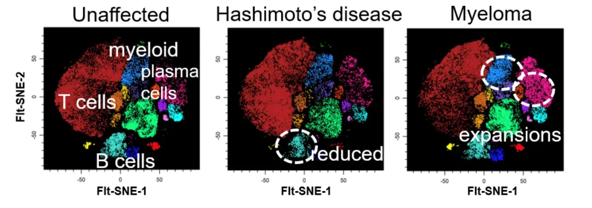 Visualisation of dimensionality reduced representations of human cell population data from diseased patients in a single family. Identification of increases or absences of cell types in patients allows identification of the cellular systems perturbed in certain diseases.